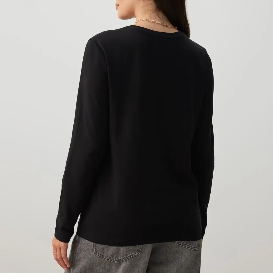 Crafted from stratchy cotton, our regular-fit black long-sleeve crew neck top is a soft and breathable choice for any casual day outfit. This staple piece effortlessly combines comfort and style, making it a must-have for your wardrobe. Style it with your favourite jeans, skirts, Leggings or layer it under a chunky knit for a trendy fit.