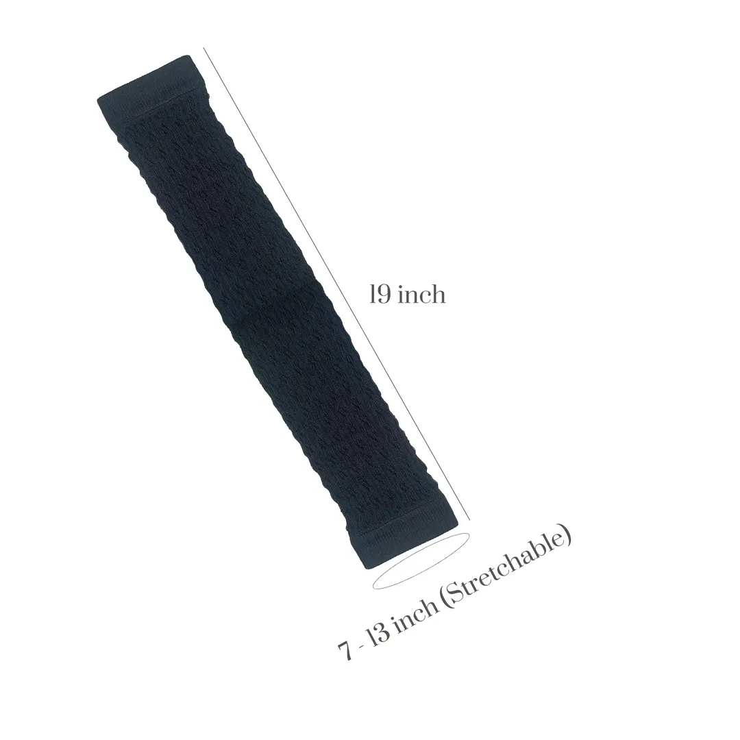 One size fits most. 80% Cotton. These warmers measure about 19″ x 7″(Stretchable 13″). Made for a stretchy comfy fit.