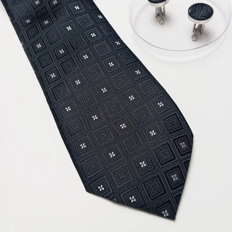 Men’s Luxury Silk Black Dot Neck Ties – Jacquard With Hanky – Cufflinks Set